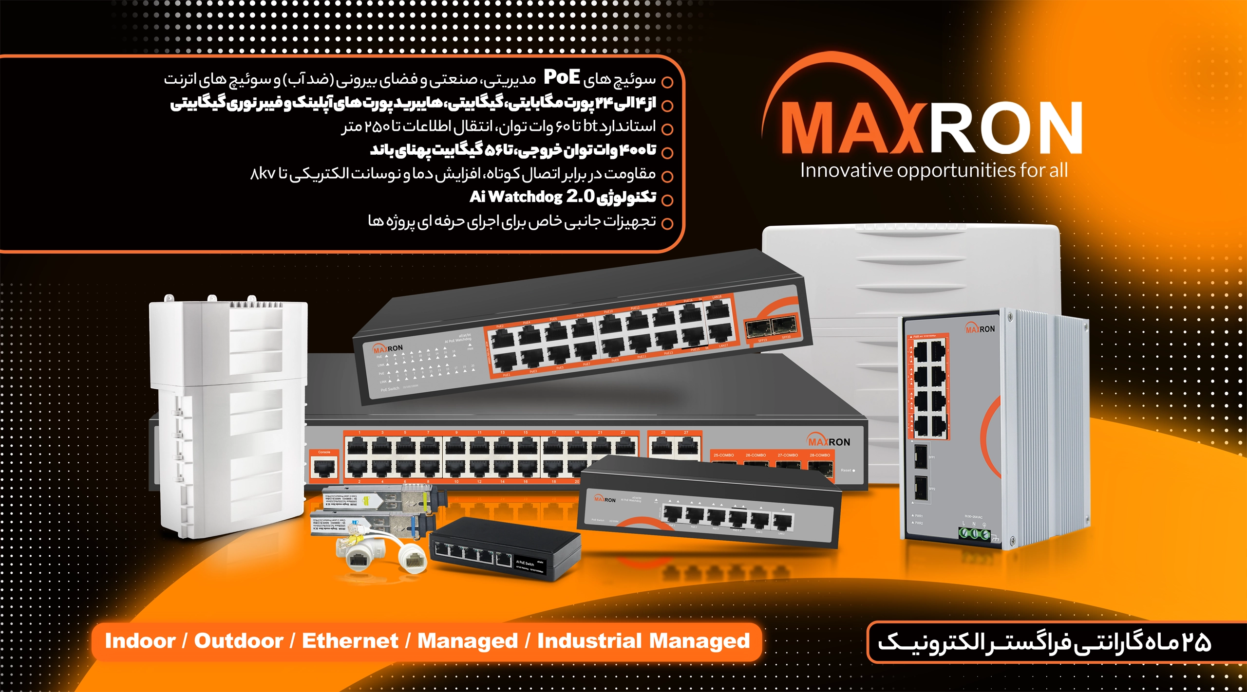 اکستندر PoE مکسرون (Maxaron) یک دستگاه است که برای گسترش برد و توان PoE (Power over Ethernet) در شبکه های کامپیوتری و نظارتی استفاده می شود. این دستگاه به شما امکان می دهد تا تجهیزات نظارتی (مثل دوربین های IP) را که از طریق PoE تغذیه می شوند، در مسافت های طولانی تری از سوئیچ یا نود شبکه قرار دهید.